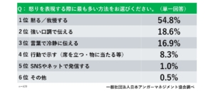 一方で、60.0%が「怒りを表に出さないタイプ」と回答し、最も多い対処法は「黙る/我慢する」(54.8%)でした。感情を内に溜め込む「我慢する文化」が健康被害拡大の一因となっている可能性が高く、現代日本が抱える構造的な課題として無視できない結果 となりました。