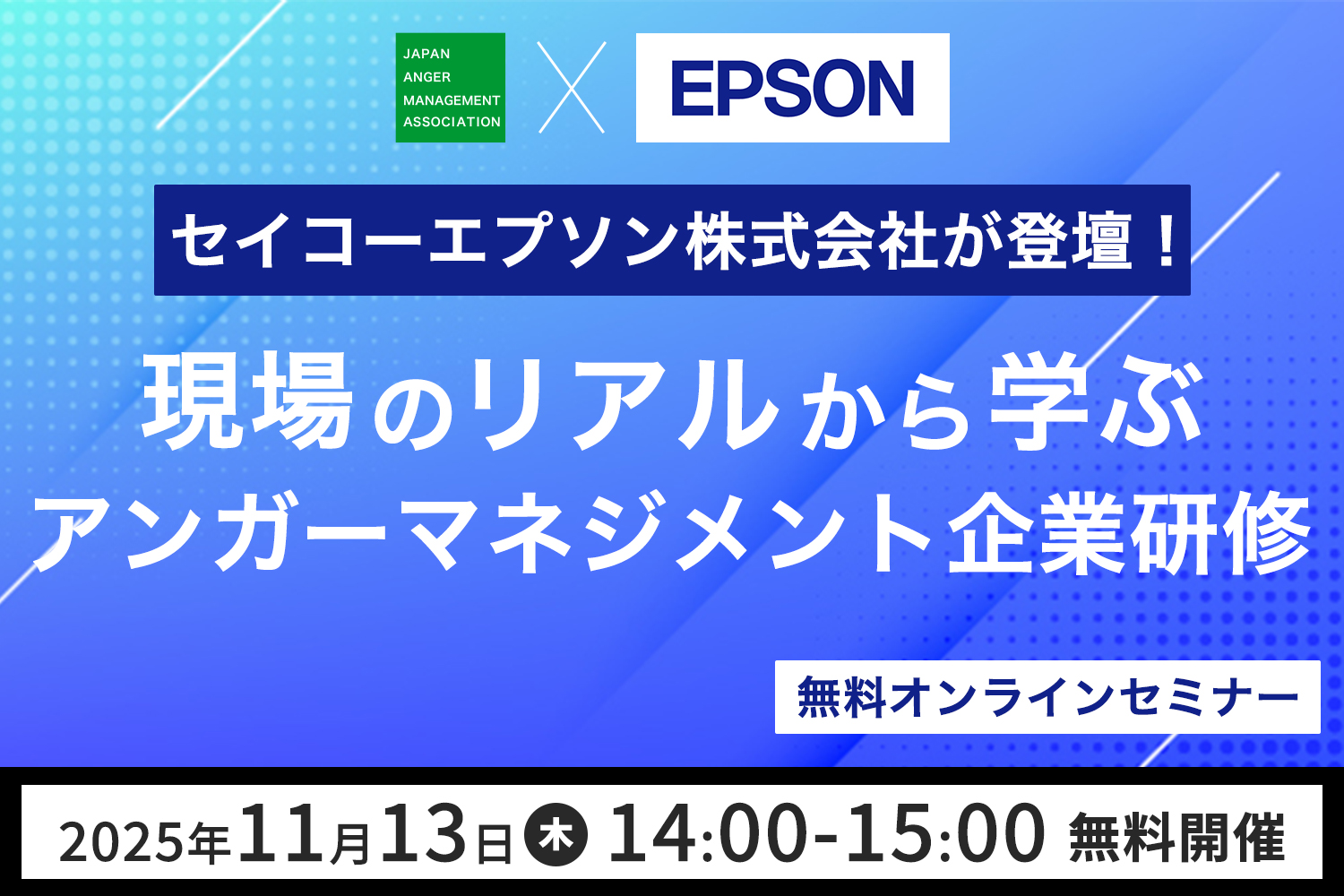 本セミナーでは、アンガーマネジメント研修を導入しているセイコーエプソン株式会社をゲストに迎え、研修導入の背景や実施までのプロセス、実施後の成果や受講者の反応などを紹介します。
